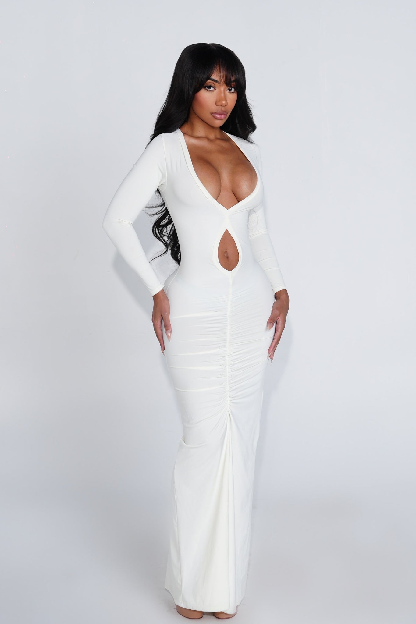 Model wearing a small. A sculpted long-sleeve gown featuring a deep plunge neckline and signature keyhole cutout that shapes the waist. Designed with contour ruching down the center for a lengthening, hourglass effect. Bold, refined, and made to command the room.