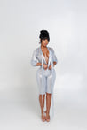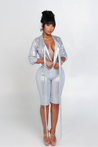 Shimmer satin capri set featuring a plunging neckline, long sleeves, and extra-long front ties for a dramatic finish.