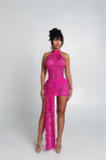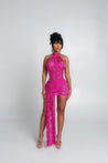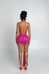 Model is wearing a size small. Boob tape recommended. Pair with skin-tone or fuchsia undergarments for a seamless look.