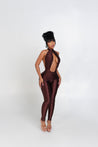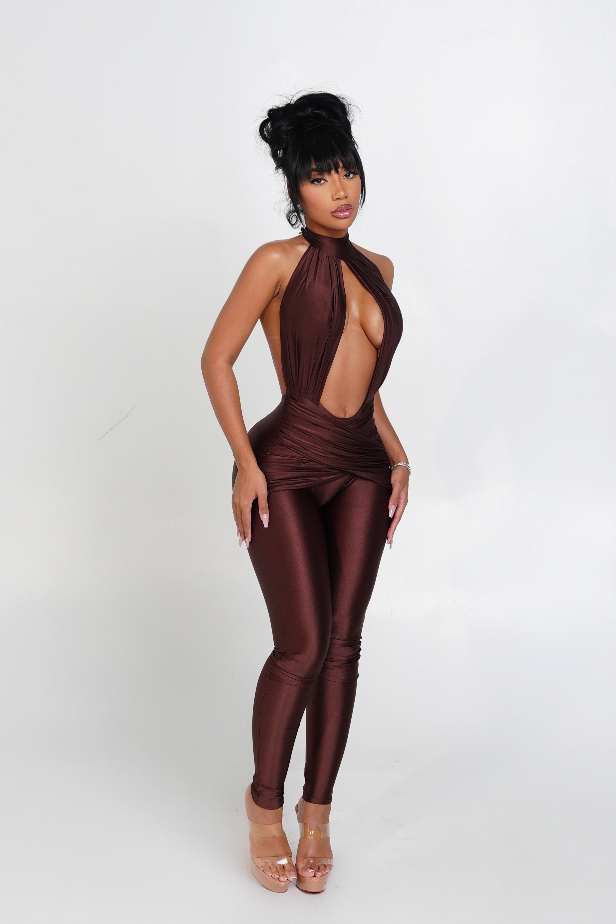 The Main Character Jumpsuit is designed to steal the spotlight—featuring a daring deep plunge, sculpted fit back out and rich chocolate sheen that hugs every curve with confidence.
