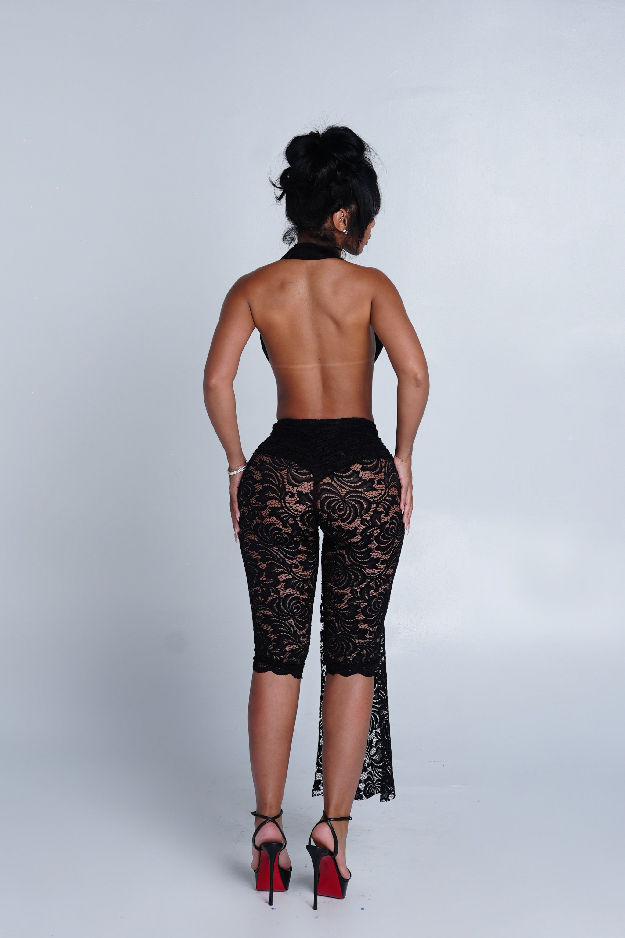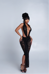 A sultry lace statement piece designed to hug every curve. This jumpsuit runs small — model is wearing a size medium. For the best fit, we recommend sizing up. Luxe, stretchy lace fabric with a daring plunge and body-sculpting silhouette.
