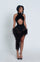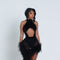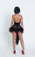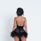 Model wears size small. This two-piece set features a velvet stretch bodysuit paired with a sheer mesh skirt trimmed in luxe ostrich feathers. Designed to command attention — sultry, elevated, and undeniably Scorpio.