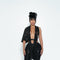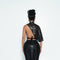 Dark, fluid, and effortlessly bold. This two-piece set features a sheer draped top with a plunging neckline and adjustable wrap tie, paired with curve-hugging capri bottoms. Designed in a stretch, high-shine fabric for a sculpted, luxe finish.