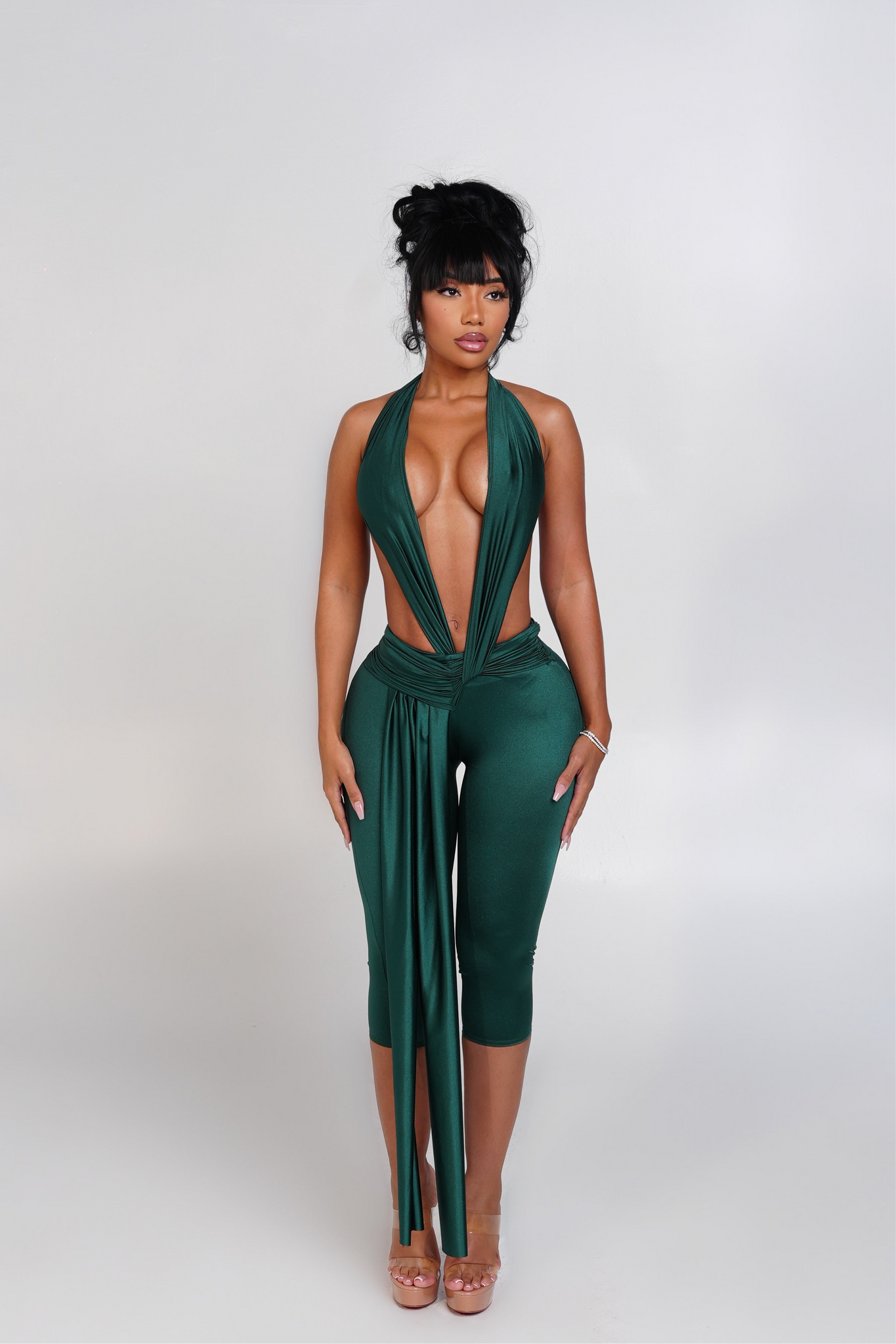 Step into effortless allure with this figure-hugging jumpsuit. Designed with a plunging draped front and tie detail, it’s cut from a luxe stretch fabric that moves with your body while sculpting your curves. Model is wearing a size small.
