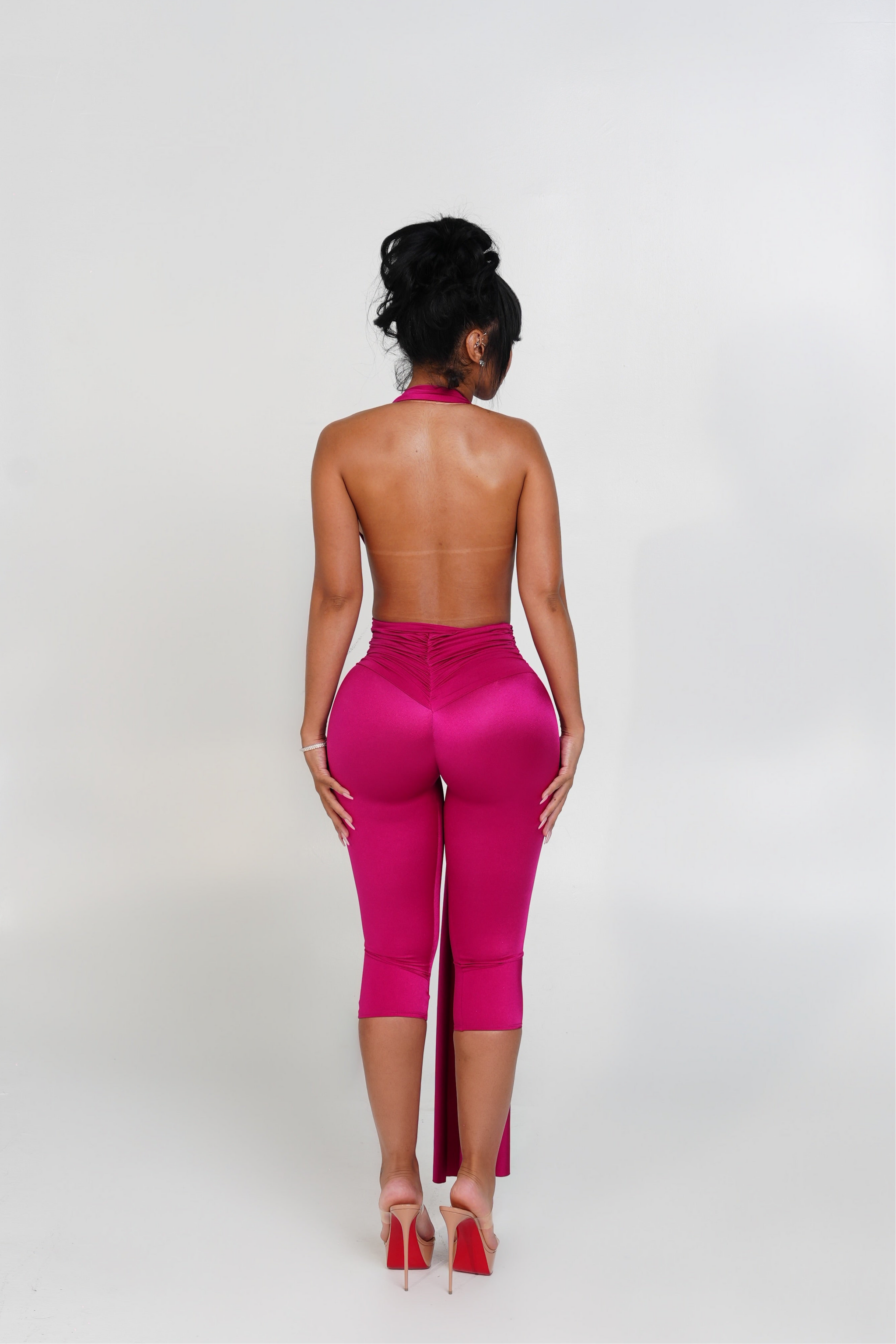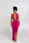 Step into effortless allure with this figure-hugging jumpsuit. Designed with a plunging draped front and tie detail, it’s cut from a luxe stretch fabric that moves with your body while sculpting your curves. Model is wearing a size small.